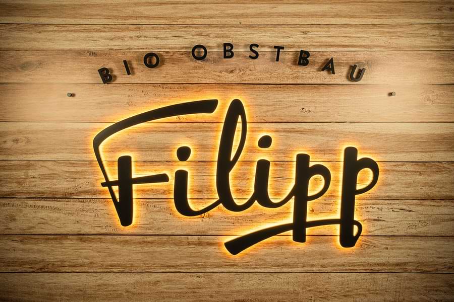 Logo als rückleuchtende LED Buchstaben; "Bio Obstbauernhof" als unbeleuchtete 3D-Buchstaben