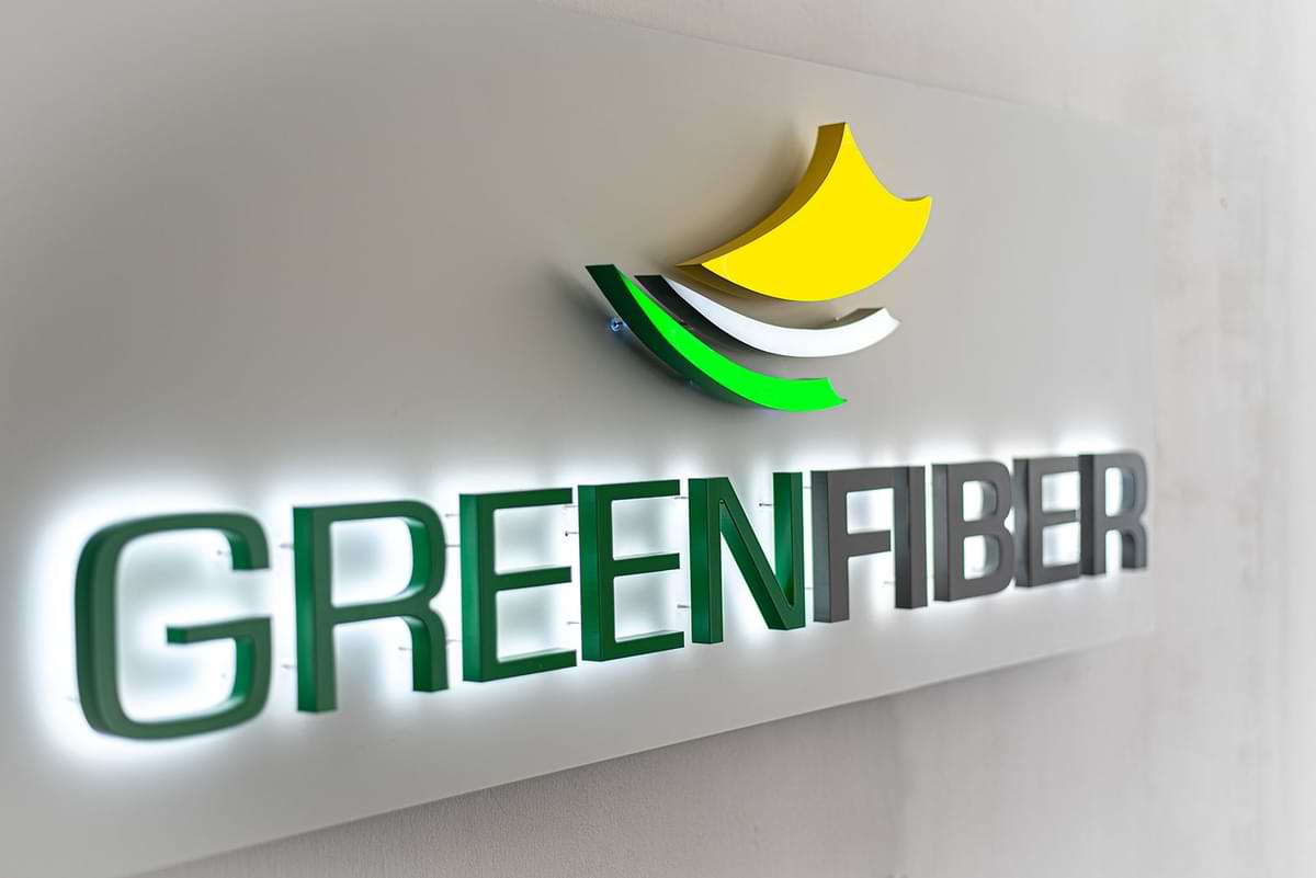 "Logostreifen" als frontleuchtende Elemente; "Greenfiber" als rückleuchtende Buchstaben