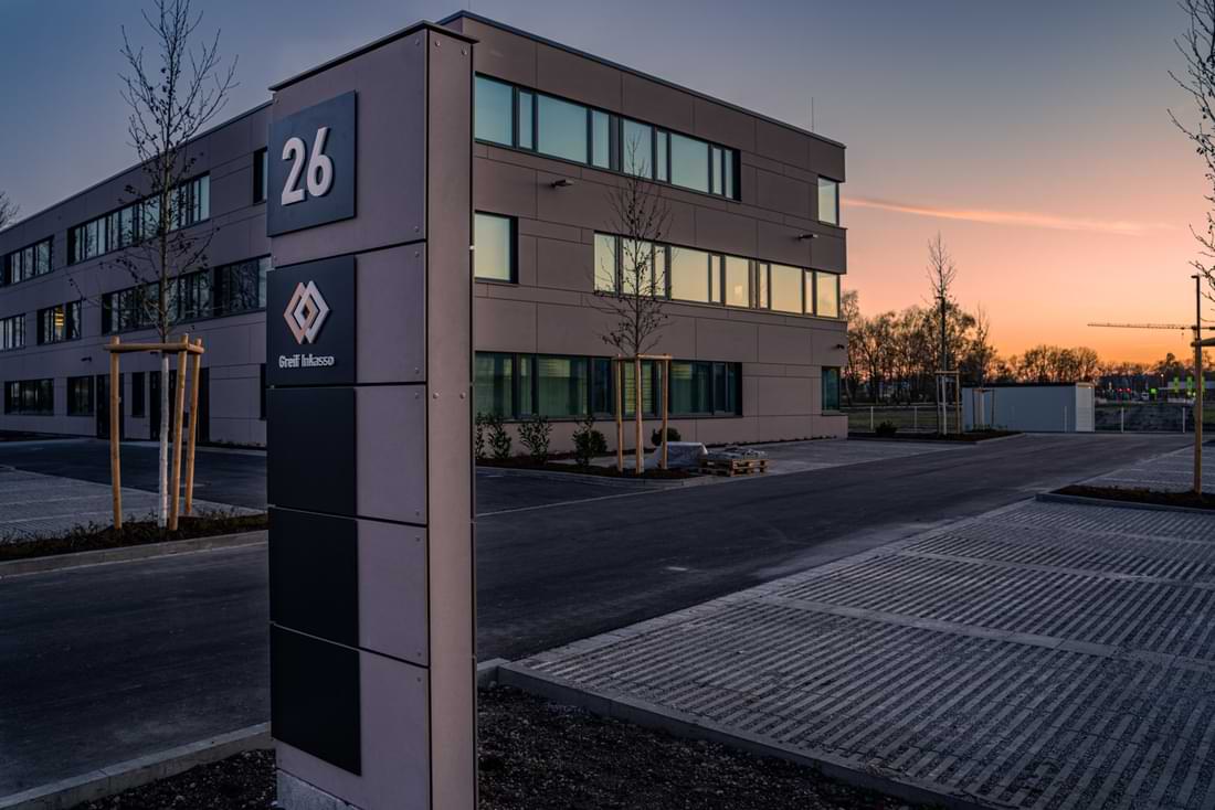 Werbepylon mit Equitone Platten Verkleidung und aufgesetzten Beschriftungsfeldern