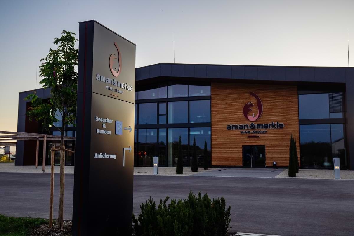 Werbepylon mit Konturbeleuchtung, beleuchteter Logobeschriftung und Wegeführung für Besucher